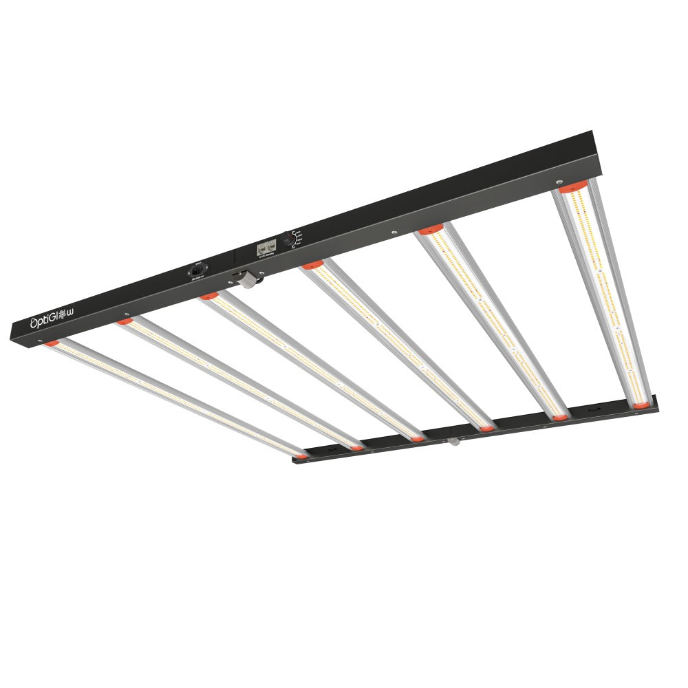 The OptiGlow LED will perfectly illuminate a 1.2m x 1.2m - 1.5m x 1.5m grow space. It can be used once cuttings are rooted or seedling are established if desired. Due to the high output of modern LEDs such as this fixture we recommend starting with a hanging height of around 45cm from the canopy. Whilst there is next to no risk of heat stress on plants, the high PPF can be a little strong from some plants so by starting with a higher hanging height allows them to acclimatise without issues. The unit has four dimming settings; 290w, 430w, 580w and 720w. For young plants always begin on the lowest setting and gradually increase this over the course of a few weeks until the maximum setting can comfortably be used without any signs of stress. For more established plants start around 430w-580w. As the output is increased you can also begin to decrease the space between the light and canopy. By flowering most growers are able to run the unit at full power and around 15-20cm from the top of the canopy.